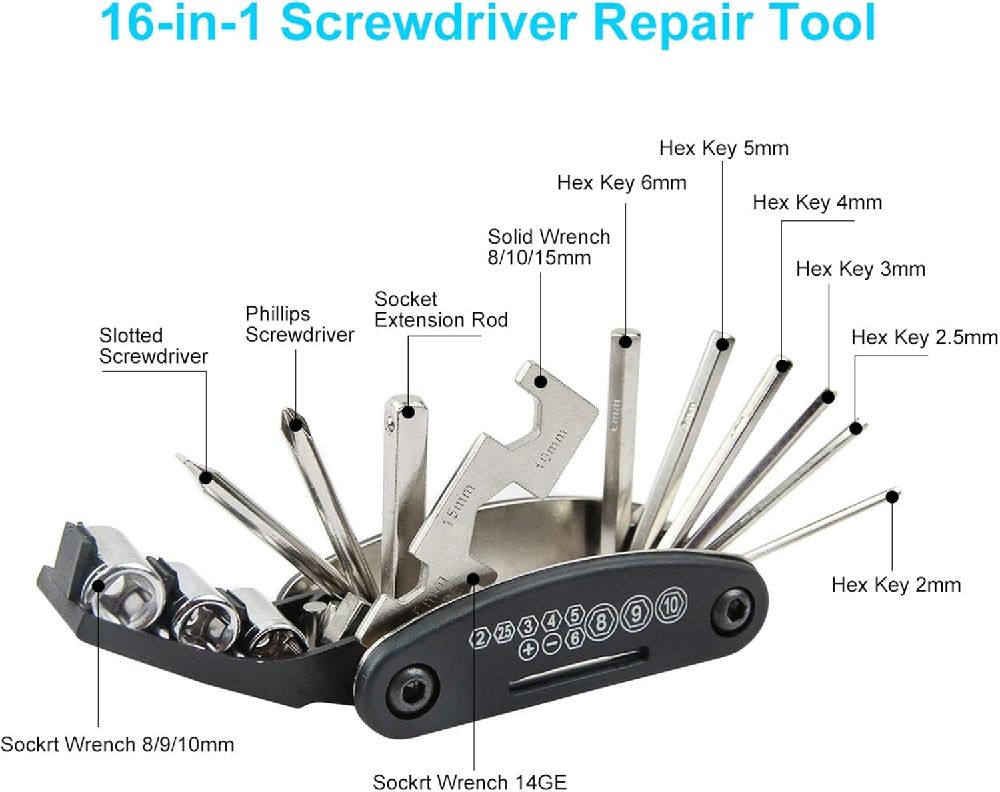 Be ready for any roadside repair with this comprehensive Bike Repair Kit, designed for mountain and road bikes. This all-in-one set includes a 16-in-1 multi-tool, 120PSI mini bike pump, pre-bonded tire patch kit, and durable bike bag. Whether you're a daily commuter or an adventure cyclist, this compact and portable repair kit ensures you can fix flat tires, adjust components, and stay on the move with ease.